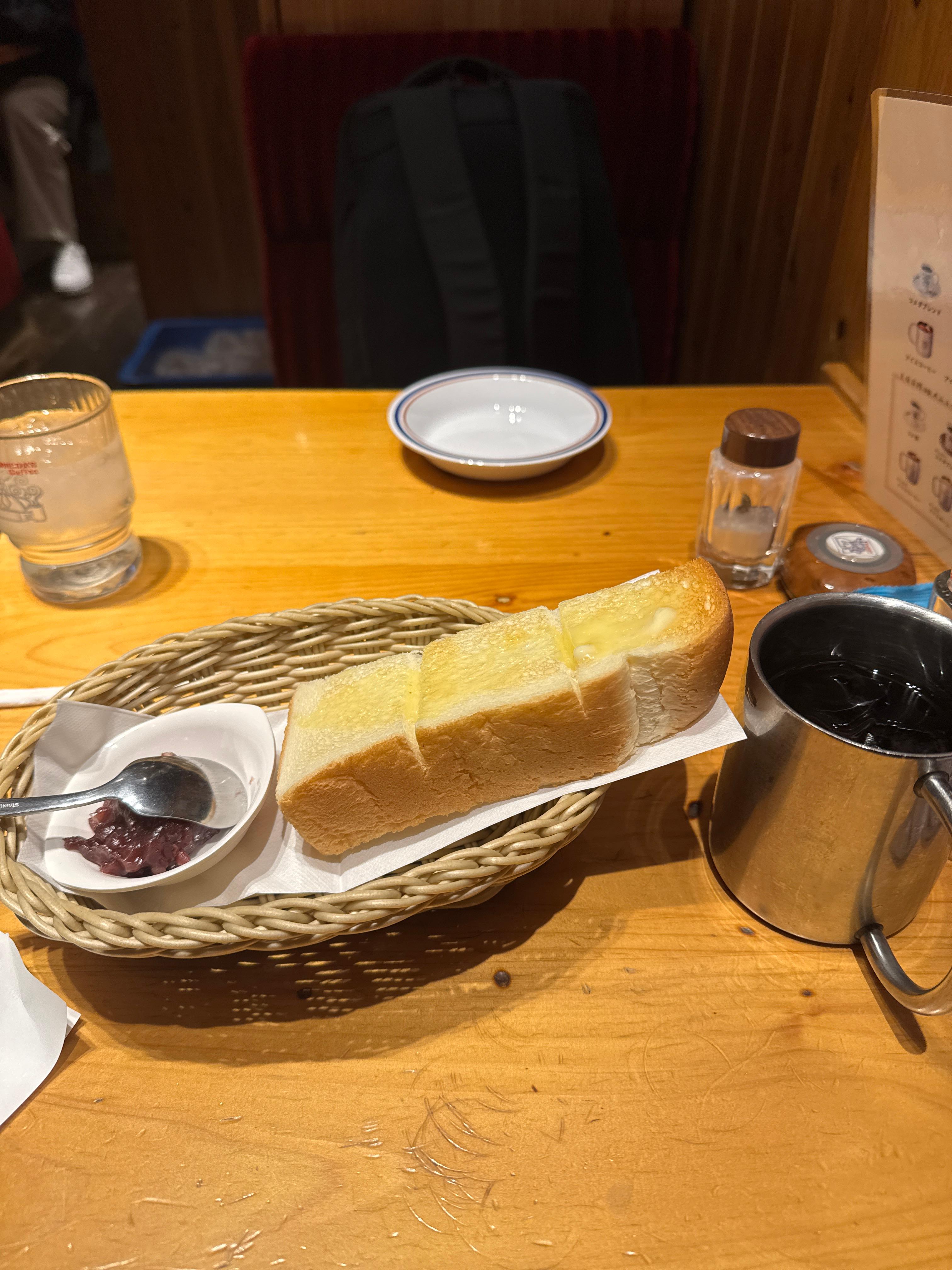 숙소 근처에서 간단하게 아침 먹고 공항으로 이동해야해서 코메다커피에 들르게 되었다. 음료를 시키면 빵이 무료기 때문에 아이스커피(540엔)를 주문하고 3번세트인 토스트에 단팥을 주는걸로 골라 간단하게 아침을 떼웠다.